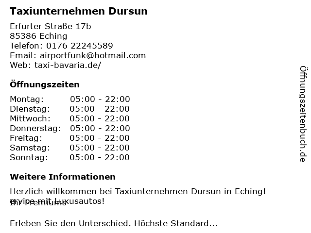 | Öffnungszeiten Taxiunternehmen Dursun in Eching anzeigen | |