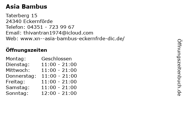 | Öffnungszeiten Asia Bambus in Eckernförde anzeigen | |