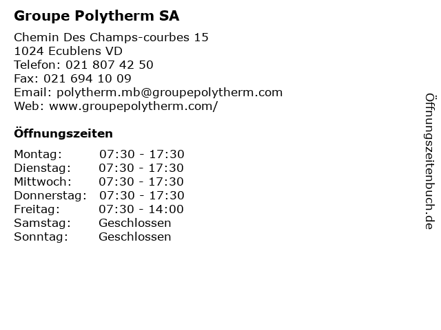 | Öffnungszeiten Groupe Polytherm SA in Ecublens VD anzeigen | |