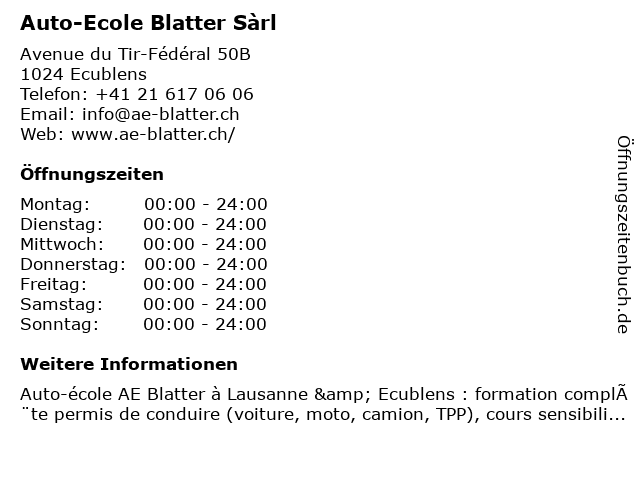 | Öffnungszeiten Auto-Ecole Blatter Sàrl in Ecublens anzeigen | |