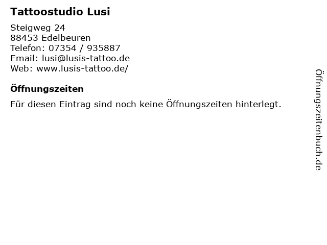 | Öffnungszeiten Tattoostudio Lusi in Edelbeuren anzeigen | |