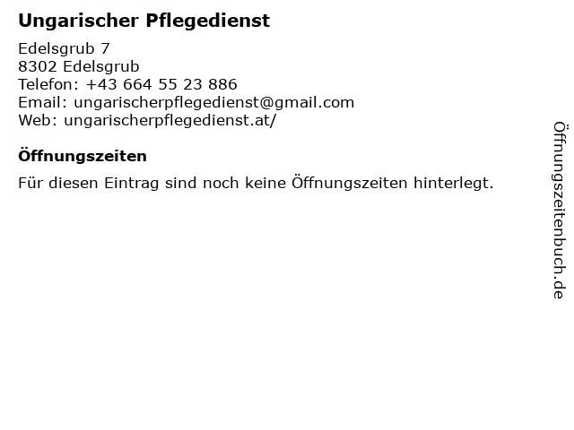 | Öffnungszeiten Ungarischer Pflegedienst in Edelsgrub anzeigen | |