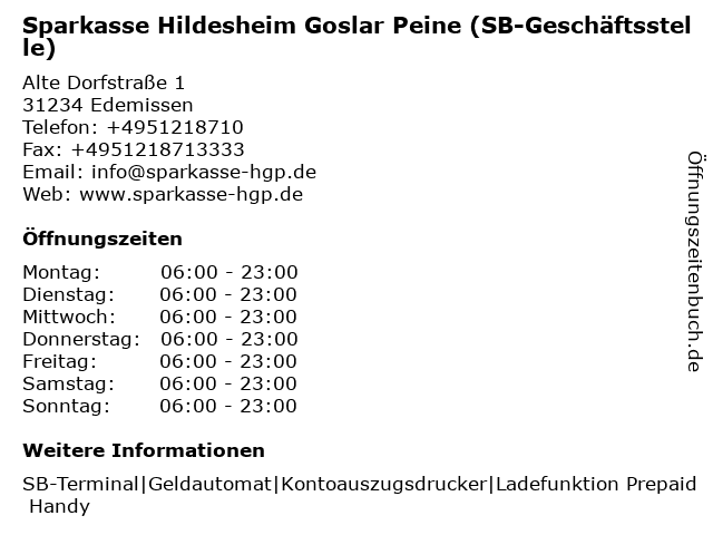5 Sparkasse Hildesheim Goslar Peine (SB-Filiale) (Entfernung: 11,25 km) Alte Landstraße 14, 31226 Peine 6 Sparkasse Hildesheim Goslar Peine (SB-Filiale) (Entfernung: 11,57 km) Schützenstraße 17, 31241 Ilsede |