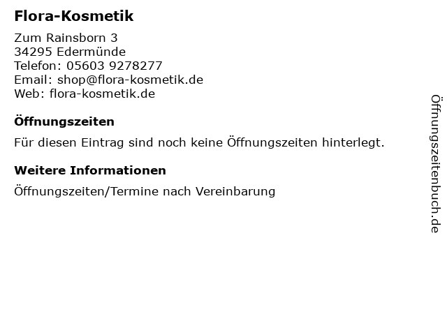 | Öffnungszeiten Flora-Kosmetik in Edermünde anzeigen | |