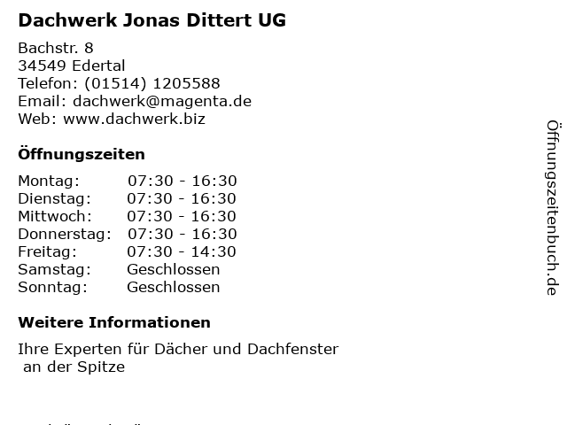 | Öffnungszeiten Dachwerk Jonas Dittert UG in Edertal anzeigen | |