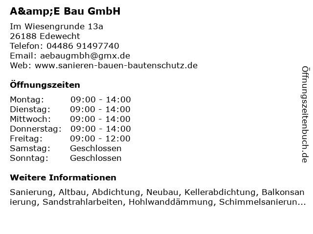 | Öffnungszeiten A&E Bau GmbH in Edewecht anzeigen | |