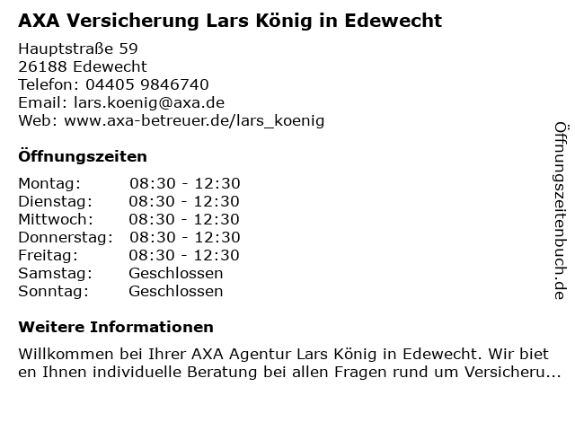 1 AXA Versicherung - Bezirksvertretung Rudolf Hinrichs (Entfernung: 1,21 km) Breeweg 93, 26188 Edewecht 3 AXA Versicherung - Generalvertretung Wilfried Zirpins (Entfernung: 7,96 km) Hainbuchenstr. 18, 26188 Edewecht 4 AXA Versicherung - Generalvertretung Joachim Jürgens (Entfernung: 13,94 km) Hundsmühler Str. 181, 26131 Oldenburg 5 AXA & DBV Hauptvertretung Dipl. Kfm. Marcus Heintze (Entfernung: 13,95 km) Hauptstr. 85, 26131 Oldenburg 6 |