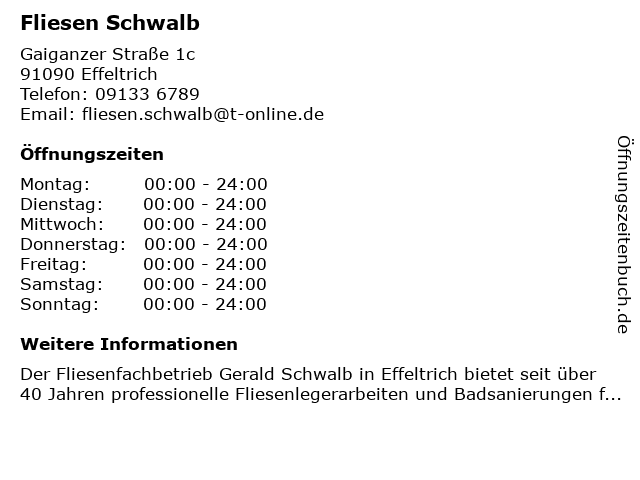 Öffnungszeiten Fliesen Schwalb in Effeltrich anzeigen | |