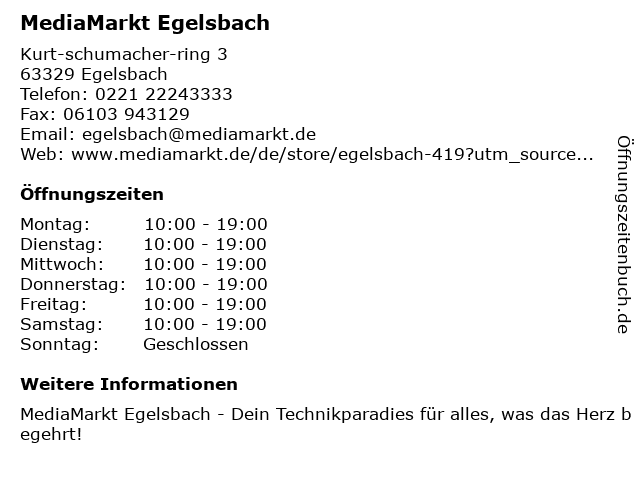 Öffnungszeiten MediaMarkt Egelsbach in Egelsbach anzeigen | |