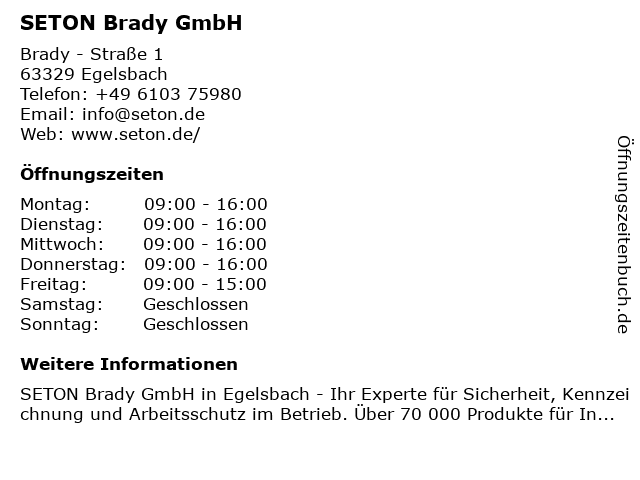 | Öffnungszeiten SETON Brady GmbH in Egelsbach anzeigen | |