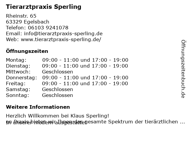 | Öffnungszeiten Tierarztpraxis Sperling in Egelsbach anzeigen | |