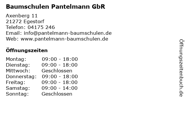 | Öffnungszeiten Baumschulen Pantelmann GbR in Egestorf anzeigen | |
