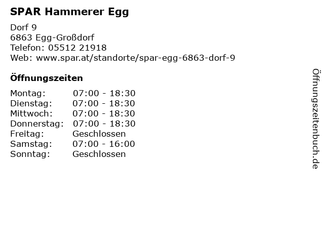 | Öffnungszeiten SPAR Hammerer Egg in Egg-Großdorf anzeigen | |