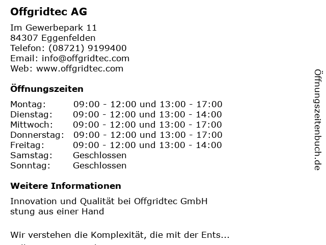 | Öffnungszeiten Offgridtec AG in Eggenfelden anzeigen | |