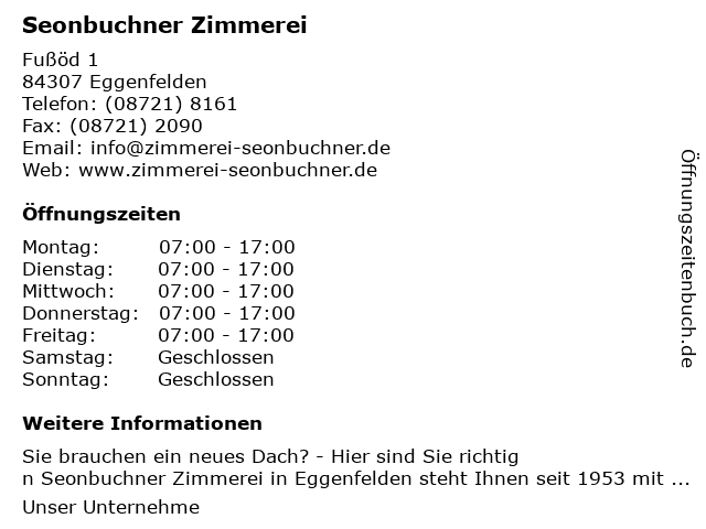| Öffnungszeiten Seonbuchner Zimmerei in Eggenfelden anzeigen | |