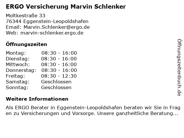 | Öffnungszeiten ERGO Versicherung Marvin Schlenker in Eggenstein-Leopoldshafen anzeigen | |