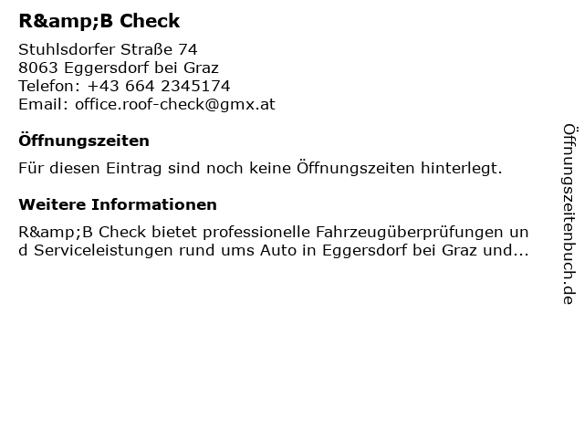 | Öffnungszeiten R&B Check in Eggersdorf bei Graz anzeigen | |