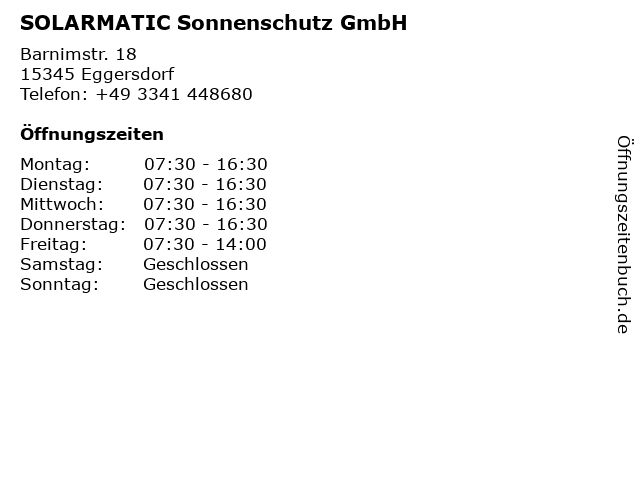 3 Solar matic Eurotex design GmbH Sonnenschutz (Entfernung: 15,58 km) Myslowitzer Str. 27 -29, 12621 Berlin 6 1a Sonnenschutz Sonnenschutzeinrichtungen, Alexander Schreitel (Entfernung: 18,33 km) Marzahner Promenade 31, 12679 Berlin |