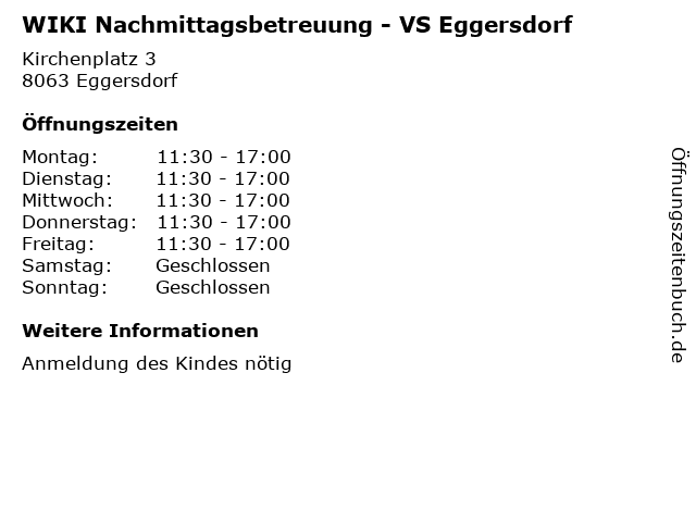 | Öffnungszeiten WIKI Nachmittagsbetreuung - VS Eggersdorf in Eggersdorf anzeigen | |