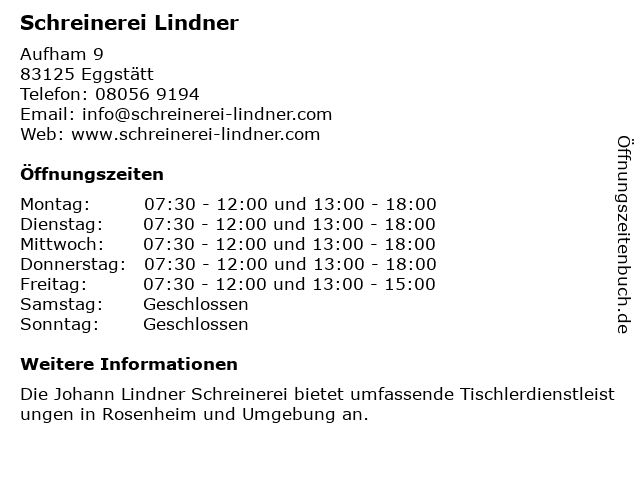 | Öffnungszeiten Schreinerei Lindner in Eggstätt anzeigen | |