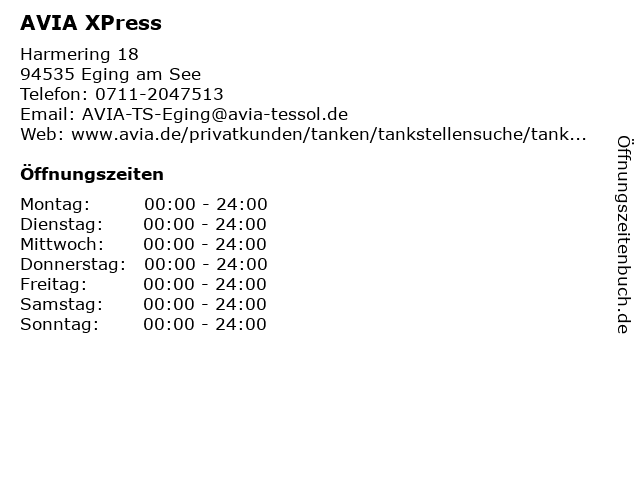 | Öffnungszeiten AVIA XPress in Eging am See anzeigen | |