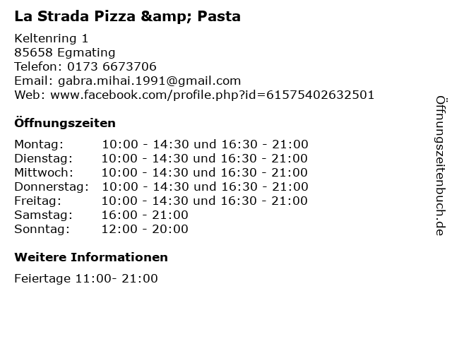 | Öffnungszeiten La Strada Pizza & Pasta in Egmating anzeigen | |