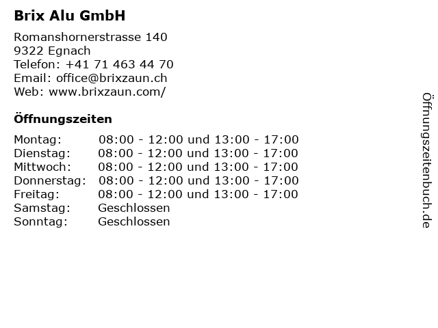 | Öffnungszeiten Brix Alu GmbH in Egnach anzeigen | |