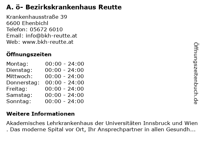2 Bezirkskrankenhaus Reutte - Allgemeine Besuchszeiten (Entfernung: 0,00 km) Krankenhausstraße 39, 6600 Ehenbichl 3 Bezirkskrankenhaus Reutte - Besuchszeiten Geburtshilfe (Entfernung: 0,00 km) Krankenhausstraße 39, 6600 Ehenbichl 4 Bezirkskrankenhaus Reutte - Besuchszeiten Intensivstation (Entfernung: 0,00 km) Krankenhausstraße 39, 6600 Ehenbichl 5 Bezirkskrankenhaus Reutte - Krankenhauskiosk (Entfernung: 0,00 km) Krankenhausstraße 39, 6600 Ehenbichl 6 Bezirkskrankenhaus Reutte - Krankenhauskiosk (Entfernung: 0,00 km) Krankenhausstraße 39, 6600 Ehenbichl |
