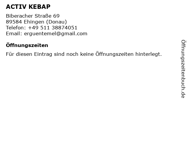 | Öffnungszeiten ACTIV KEBAP in Ehingen (Donau) anzeigen | |