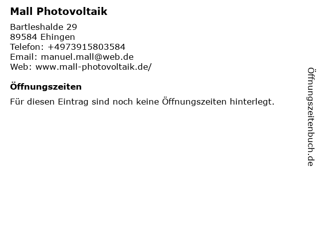 | Öffnungszeiten Mall Photovoltaik in Ehingen anzeigen | |