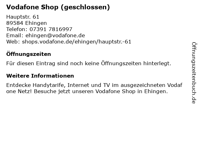 | Öffnungszeiten Vodafone Shop (geschlossen) in Ehingen anzeigen | |