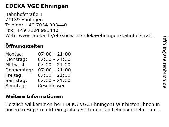 | Öffnungszeiten EDEKA VGC Ehningen in Ehningen anzeigen | |