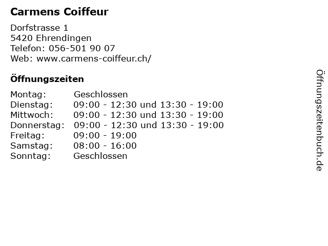 | Öffnungszeiten Carmens Coiffeur in Ehrendingen anzeigen | |