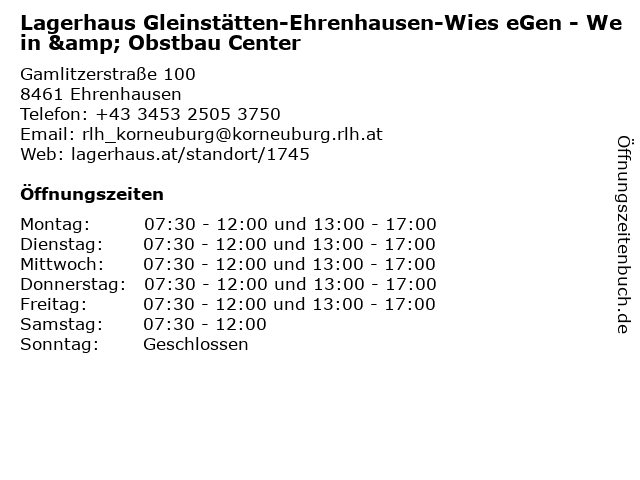 1 Lagerhaus Gleinstätten-Ehrenhausen-Wies eGen - Weinbau-Labor (Entfernung: 0,00 km) Gamlitzerstraße 100, 8461 Ehrenhausen 2 Lagerhaus Gleinstätten-Ehrenhausen-Wies eGen - alle Abteilungen (Entfernung: 0,01 km) Gamlitzerstraße 100, 8461 Ehrenhausen 3 Raiffeisenbank Gamlitz eGen - Bankstelle Ehrenhausen (Entfernung: 0,63 km) Marktplatz 25, 8461 Ehrenhausen 4 Raiffeisenbank Gamlitz eGen - (Bankomat Bankstelle) (Entfernung: 0,63 km) Marktplatz 25, 8461 Ehrenhausen 5 Lagerhaus Gleinstätten-Ehrenhausen-Wies eGen (Entfernung: 2,45 km) Rebenland-Center-Straße 3, 8472 Vogau 6 Raiffeisenbank Gamlitz eGen - (Bankomat Bankstelle) (Entfernung: 2,65 km) Obere Hauptstraße 210, 8462 Gamlitz |