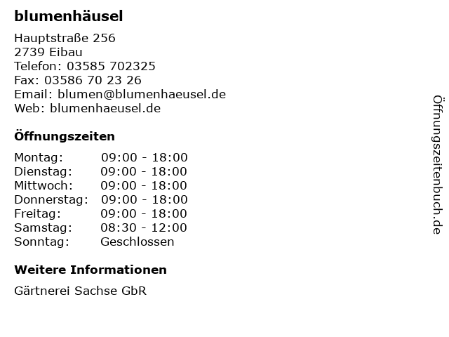 | Öffnungszeiten blumenhäusel in Eibau anzeigen | |
