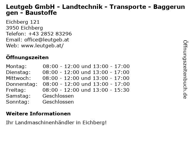 Branchen & Suchbegriffe zu Leutgeb GmbH - Landtechnik - Transporte - Baggerungen - Baustoffe:baggerungen, baustoffe, baustoffe eichberg, gebrauchte landmaschinen eichberg, landmaschinen eichberg, landmaschinenhändler eichberg, landtechnik, leutgeb, neue landmaschinen eichberg, reparatur eichberg, service eichberg, transporte, winterdienst eichberg |