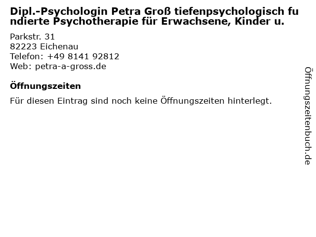 | Dipl.-Psychologin Petra Groß tiefenpsychologisch fundierte Psychotherapie für Erwachsene, Kinder u. anrufen | |