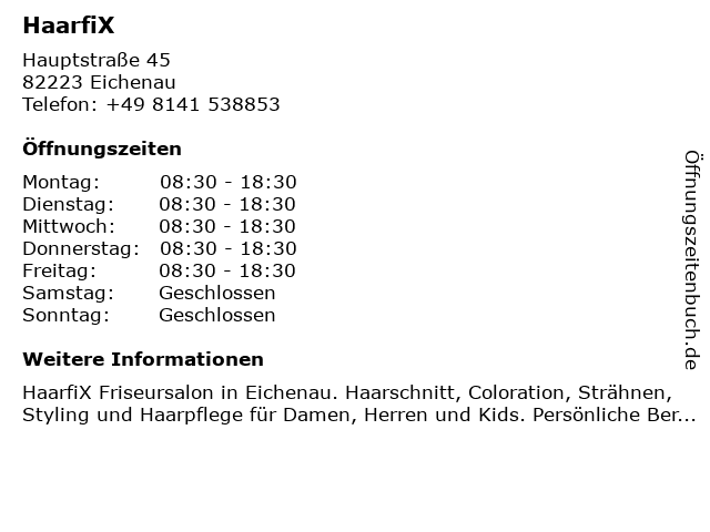 | Öffnungszeiten HaarfiX in Eichenau anzeigen | |