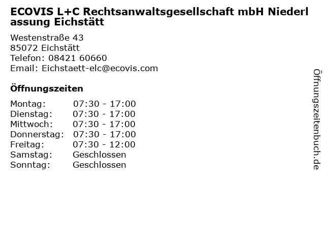 Branchen & Suchbegriffe zu ECOVIS L+C Rechtsanwaltsgesellschaft mbH Niederlassung Eichstätt:ecovis, l+c, mbh, niederlassung, rechtsanwaltsgesellschaft |