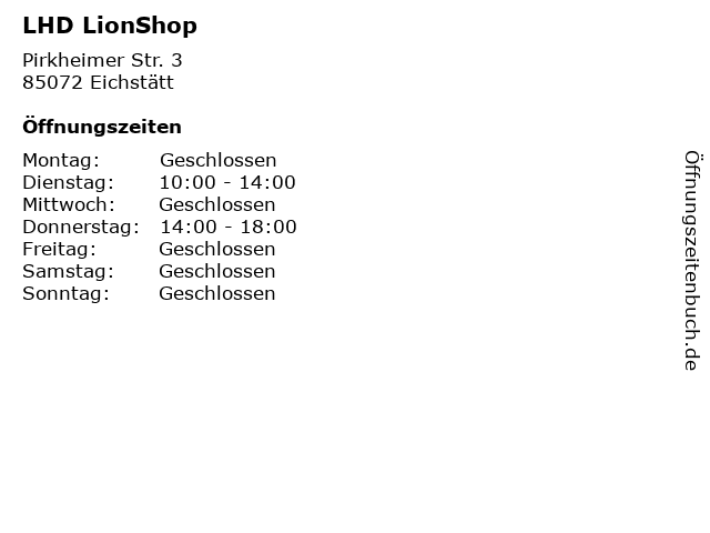 | Öffnungszeiten LHD LionShop in Eichstätt anzeigen | |