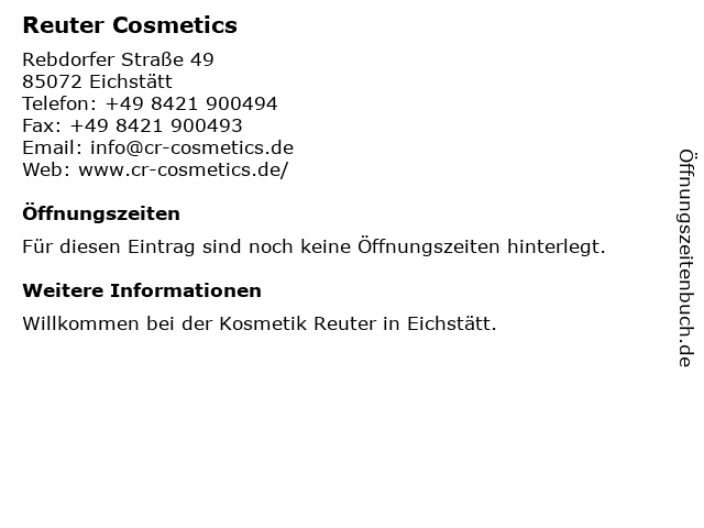 | Öffnungszeiten Reuter Cosmetics in Eichstätt anzeigen | |