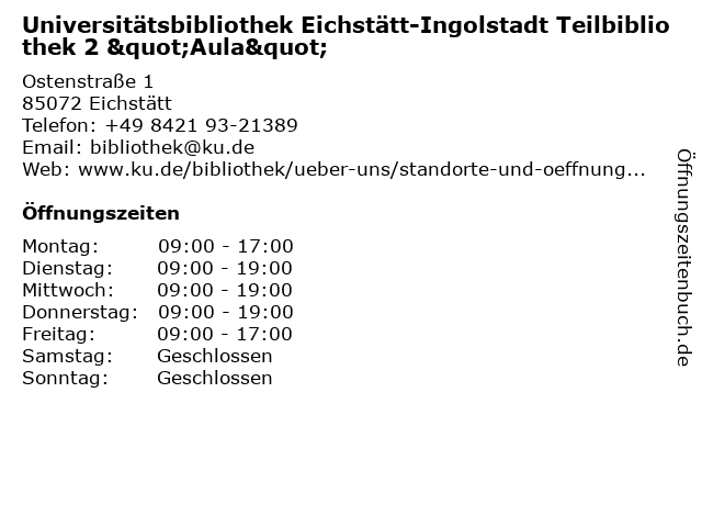 1 Universitätsbibliothek Eichstätt-Ingolstadt - Teilbibliothek 1 Ulmer Hof (Entfernung: 0,13 km) Pater-Philipp-Jeningen Platz 6, 85072 Eichstätt 2 Universitätsbibliothek Eichstätt-Ingolstadt - Teilbibliothek 3 Hofgarten (Entfernung: 0,22 km) Hofgarten 1, 85072 Eichstätt 3 Universitätsbibliothek Eichstätt-Ingolstadt - Zentralbibliothek (Entfernung: 0,55 km) Universitätsallee 1, 85072 Eichstätt 6 |