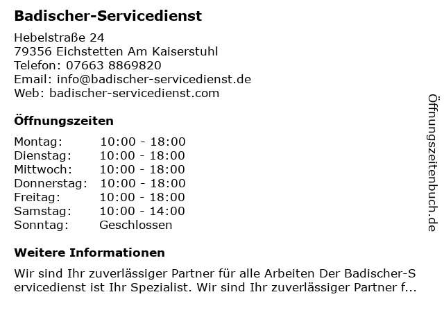 2 Badischer Textildruck Ausrüstungswerk Dersch & Co KG (Entfernung: 6,39 km) Bahnhofstr. 6, 79359 Riegel 3 Verband Badischer Rebenpflanzguterzeuger e.V. (Entfernung: 8,03 km) Badberstraße 10, 79235 Vogtsburg i.K. 5 Weinland Baden GmbH, Vertrieb badischer Weine (Entfernung: 10,12 km) Mitscherlichstr. 8, 79108 Freiburg 6 |