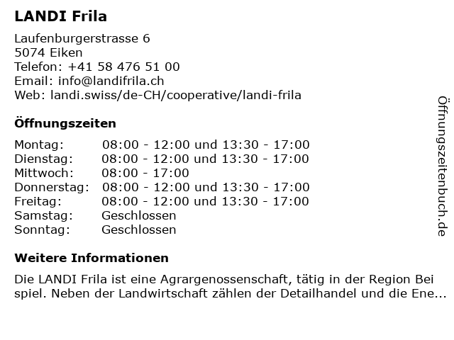 | Öffnungszeiten LANDI Frila in Eiken anzeigen | |
