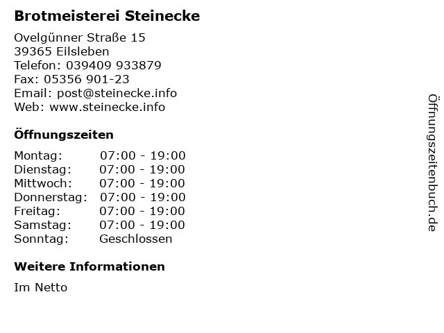 | Öffnungszeiten Brotmeisterei Steinecke in Eilsleben anzeigen | |