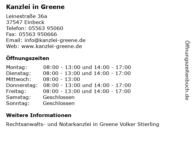 | Öffnungszeiten Kanzlei in Greene in Einbeck anzeigen | |