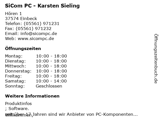 | Öffnungszeiten SiCom PC - Karsten Sieling in Einbeck anzeigen | |