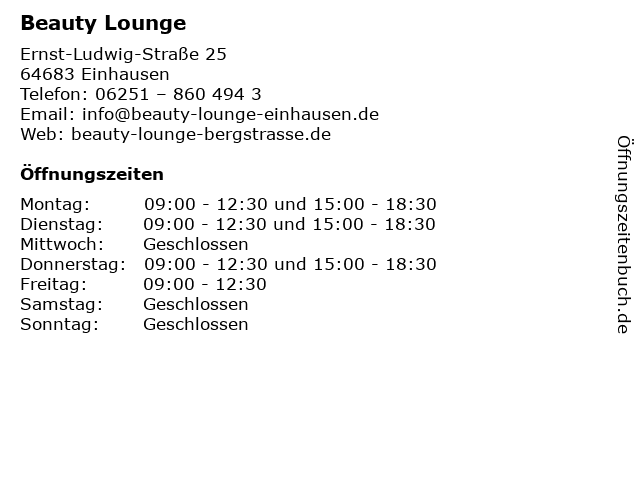 | Öffnungszeiten Beauty Lounge in Einhausen anzeigen | |