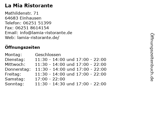 | Öffnungszeiten La Mia Ristorante in Einhausen anzeigen | |