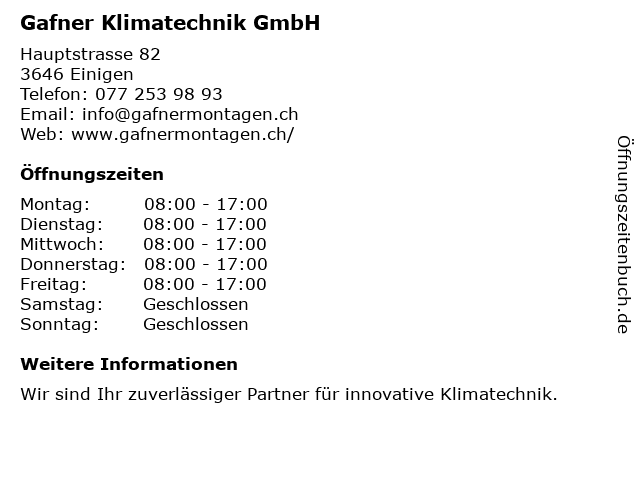 | Öffnungszeiten Gafner Klimatechnik GmbH in Einigen anzeigen | |